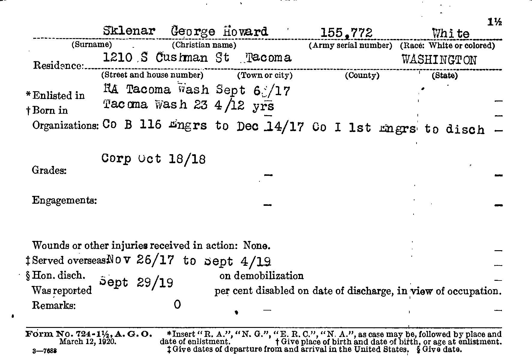 George Howard Sklenar WWI Service Record Form 724-1 1/2