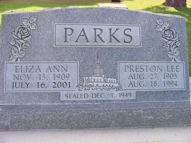 Gravestone for Preston Lee Parks and his wife Eliza Ann at Lovell Cemetery, Lovell, Big Horn Co., Wyoming. (added to findagrave.com in 2009 by Lovell Cemetery)