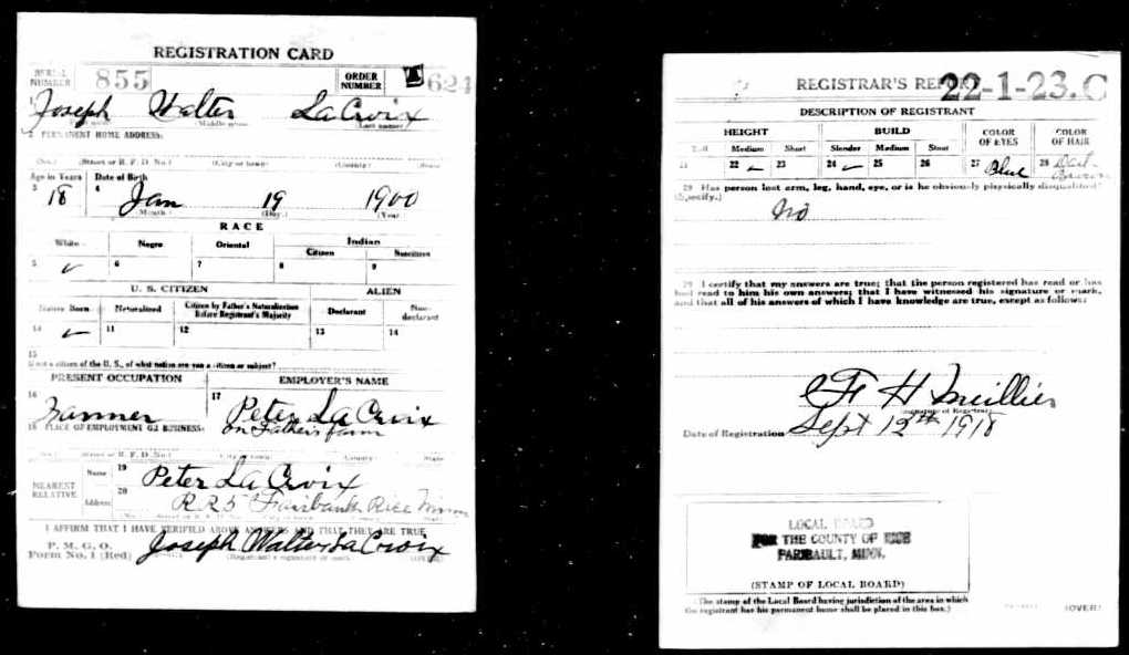Joseph Walter LaCroix WWI Draft Registraion Card