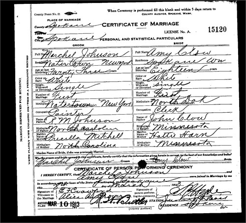 Marriage Certificate between Amy Clow and Marchel Johnson on 08Mar1913