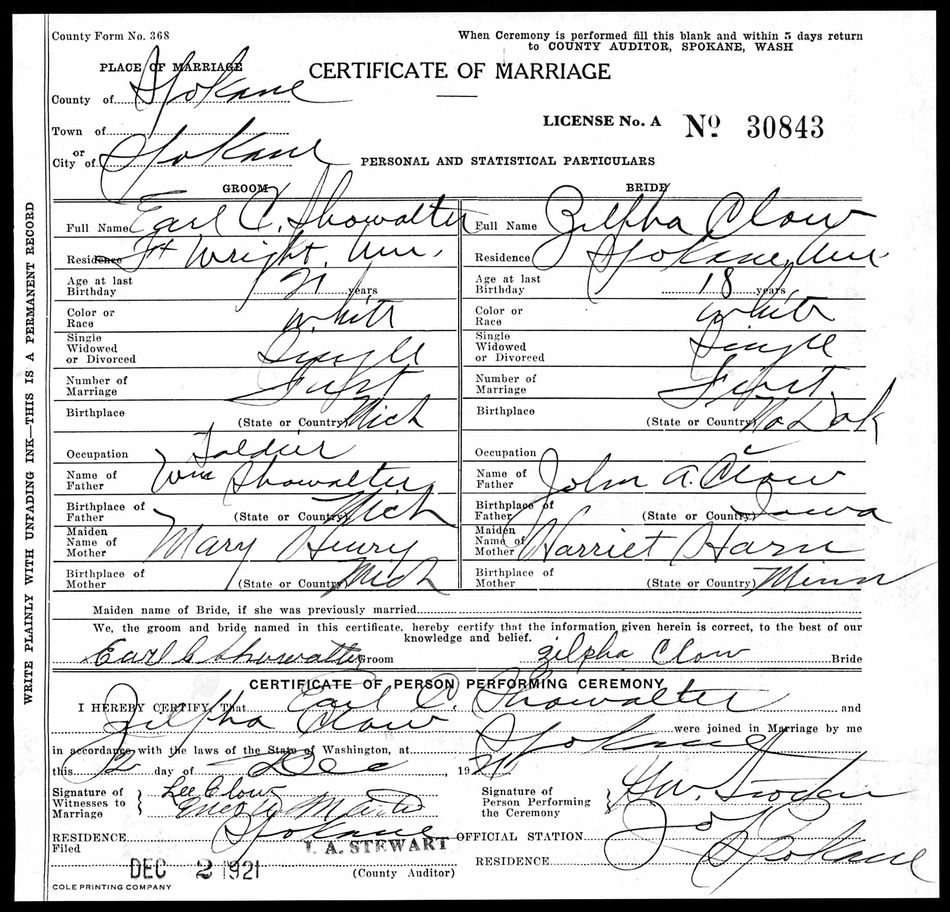 Marriage record for Zilpha Clow and Earl Showalter in 1921