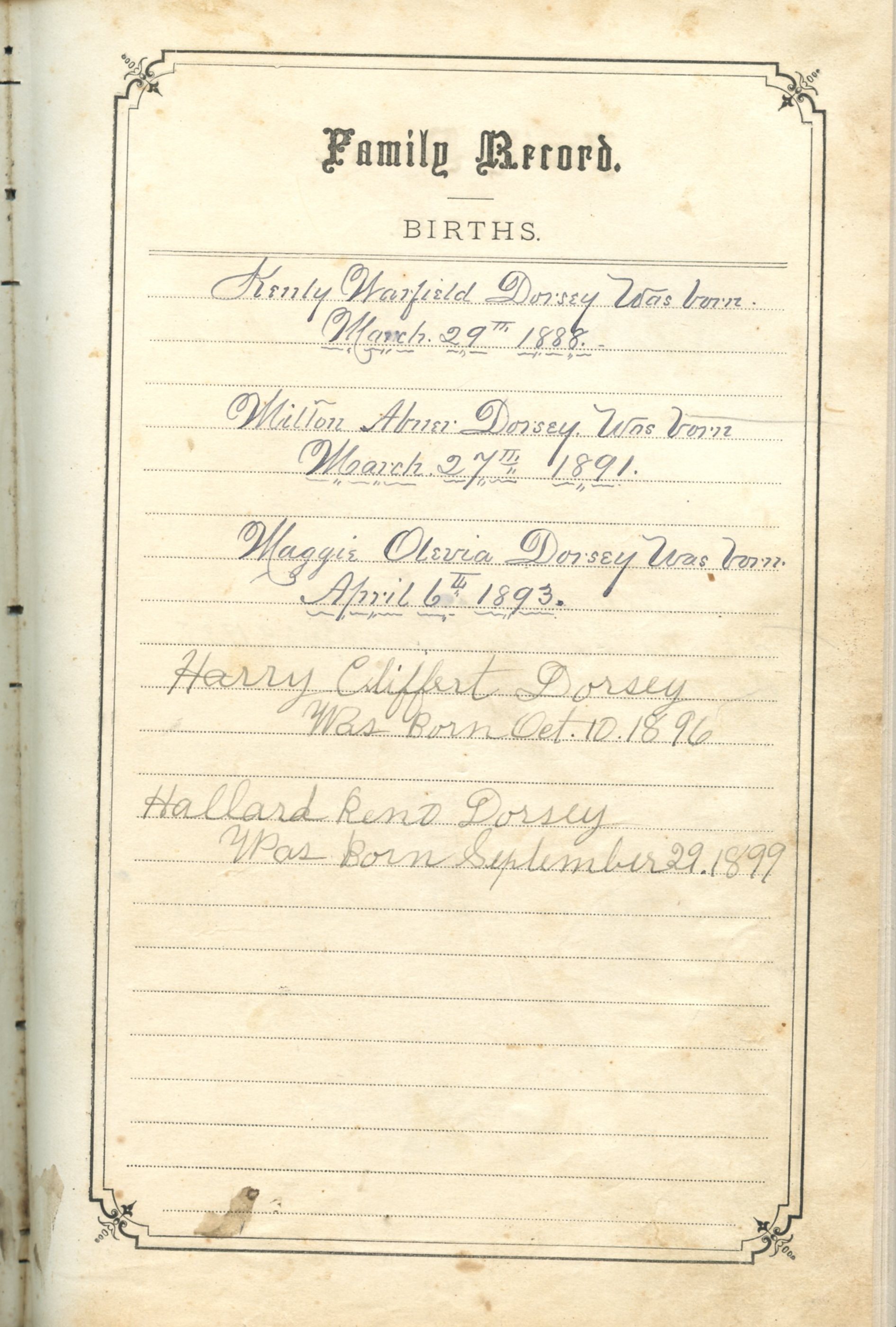 Clagett Dorsey and Laura Harn Family Bible (birth entries2)
