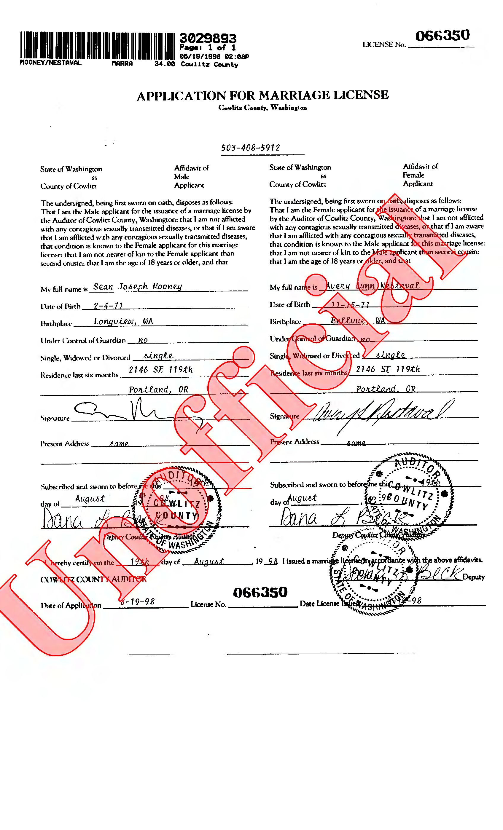 Marriage License Application for Avery Lynn Nestaval and Sean Joseph Mooney in 1998