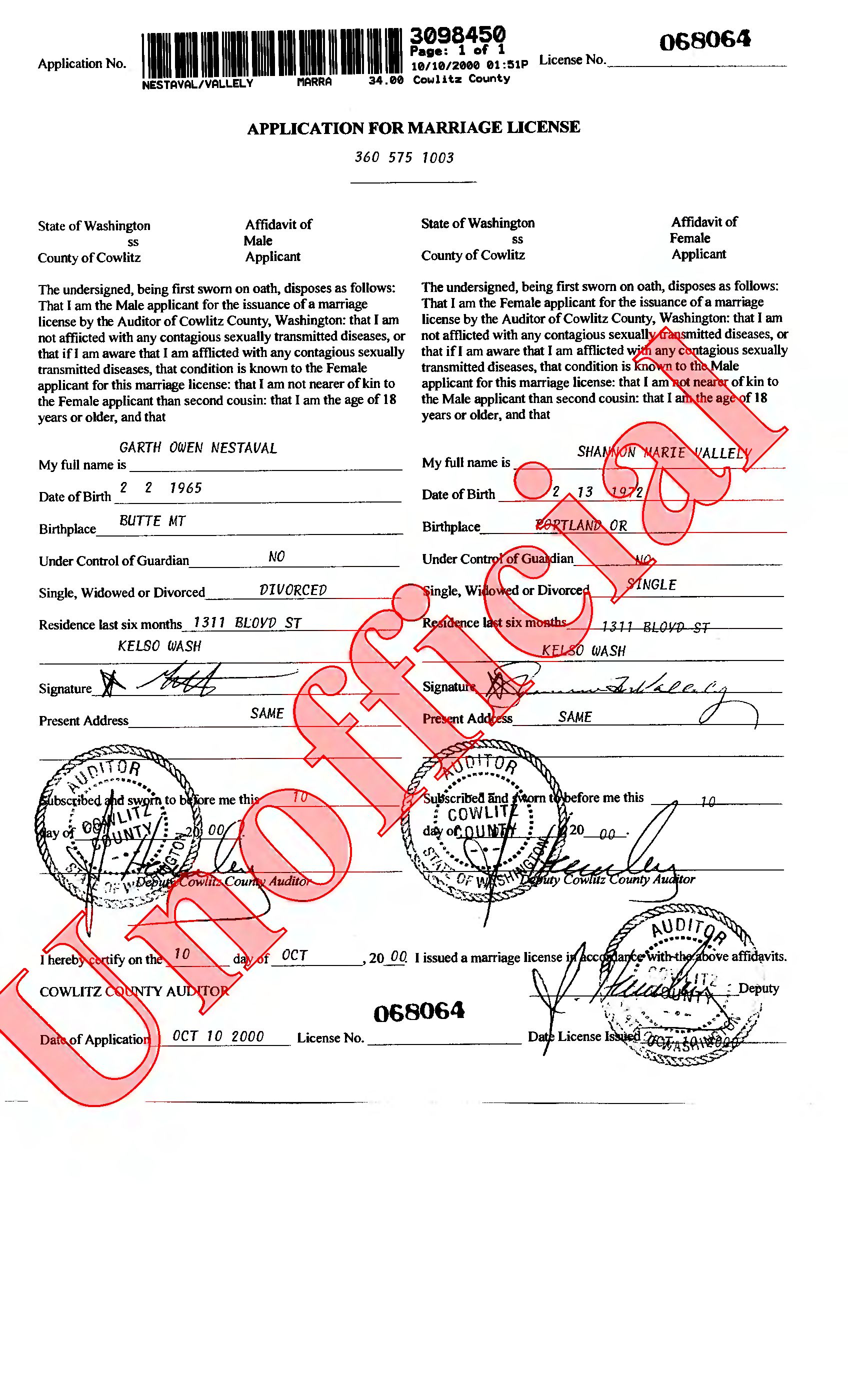 Marriage License Application for Garth Owen Nestaval and Shannon Marie Vallely in 2000