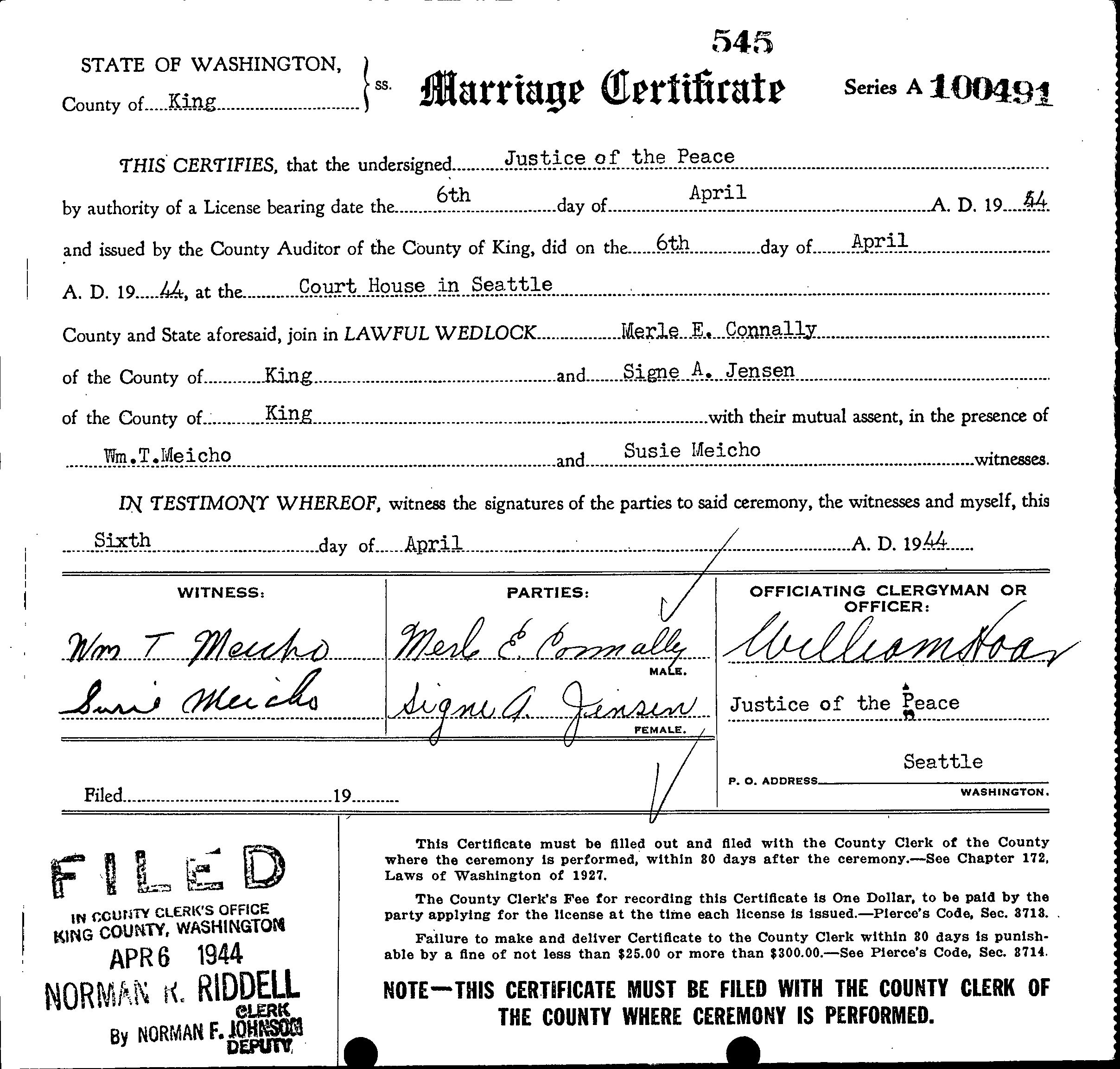 Marriage Certificate for Merle Connally and Signe Jensen in 1944