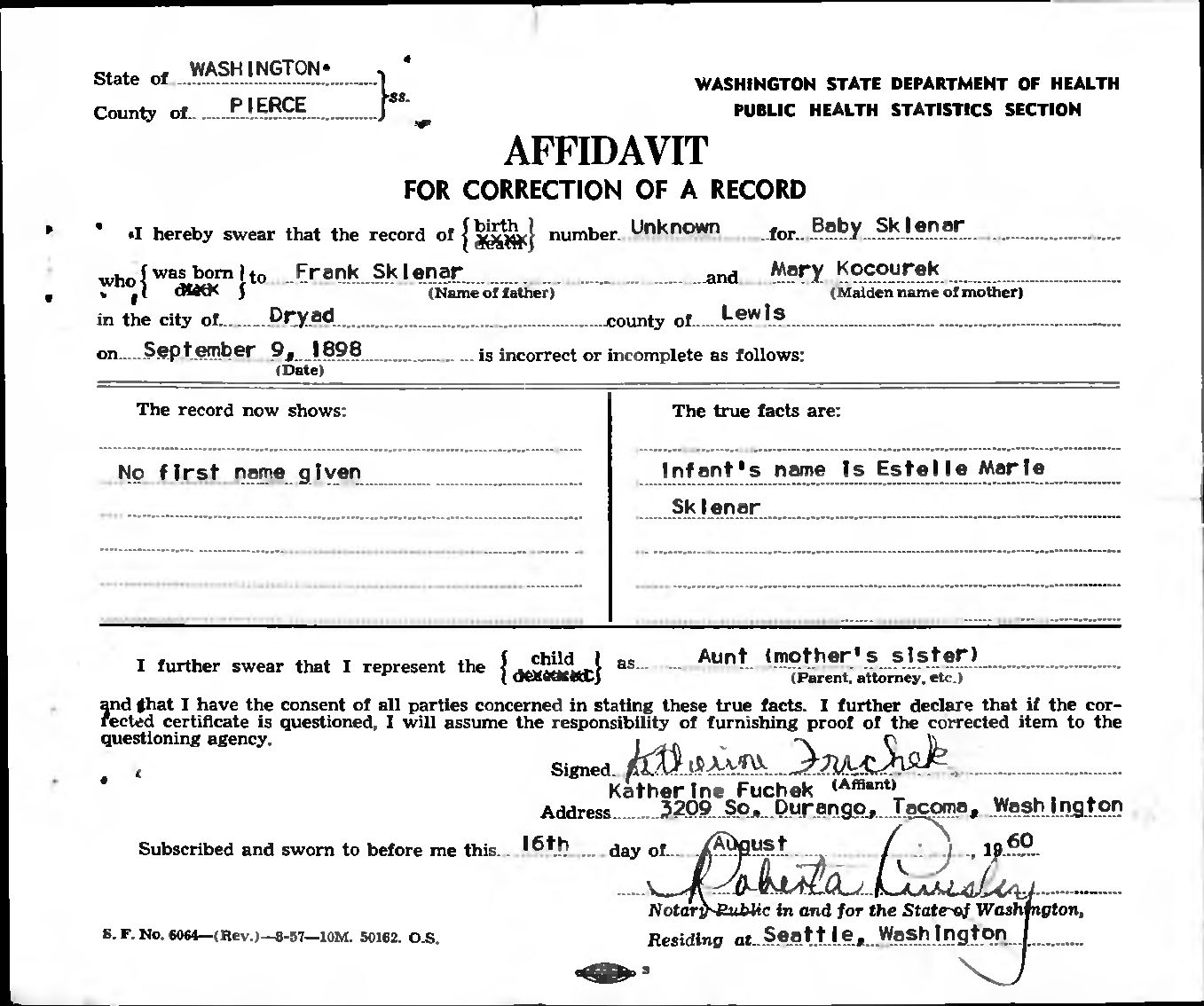 Estelle Marie Sklenar birth certificate correction (filed 16Aug1960)