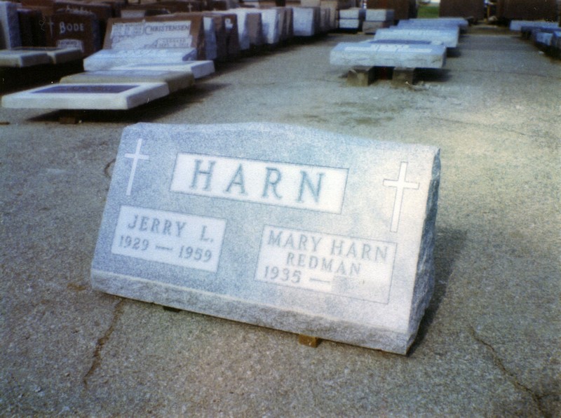 Gravestone for Jerry L. Harn (1929-1959) and Mary Harn Redman (1935-nodate). This new stone was purchased by Mary Lou after she was diagnosed with terminal cancer, to replace the gravestone that just had Jerry on it.