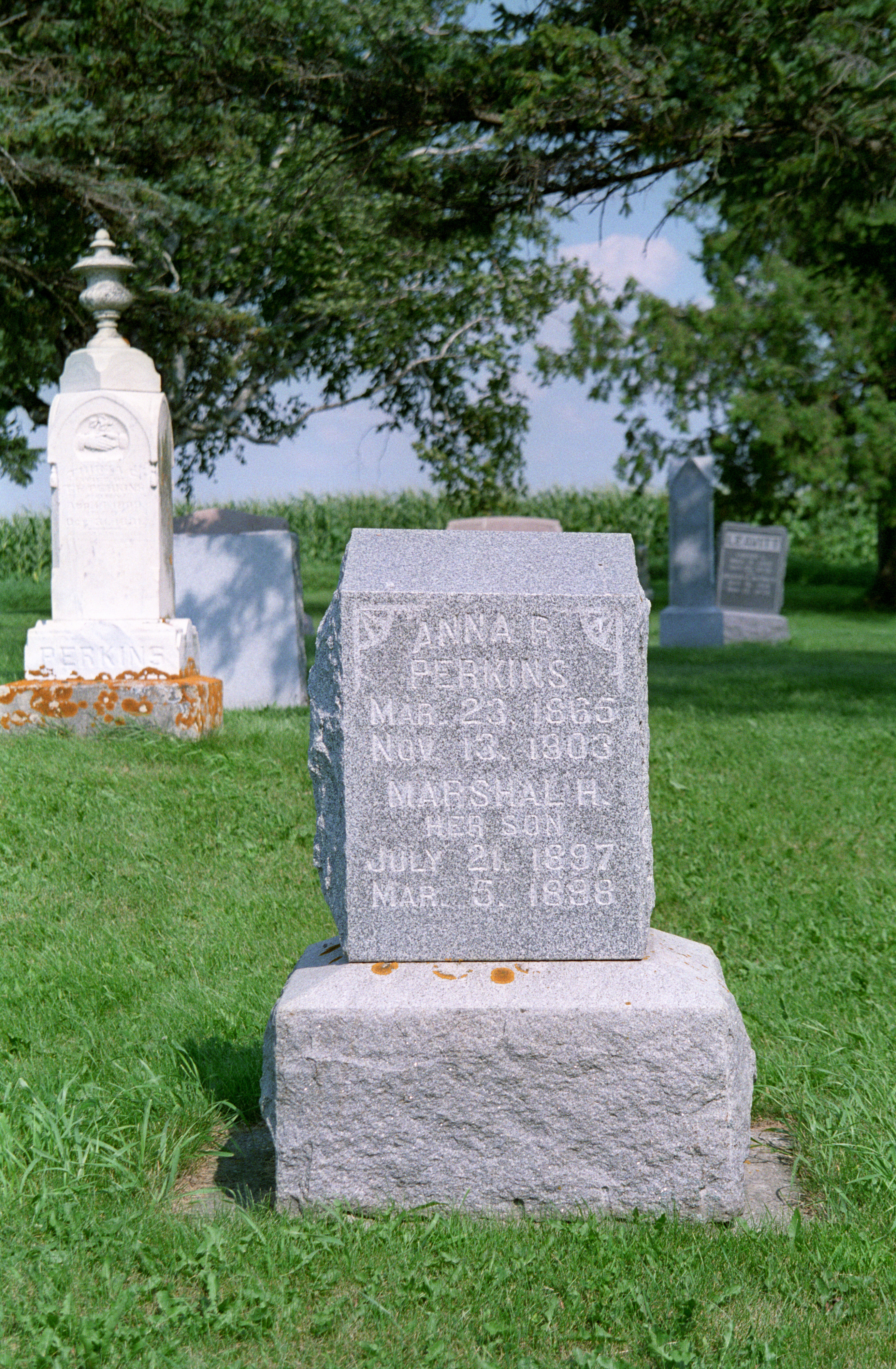 Gravetone of Anna R. Purdy (1865-1903) and her son Marshall. H. Perkins (1897-1898)