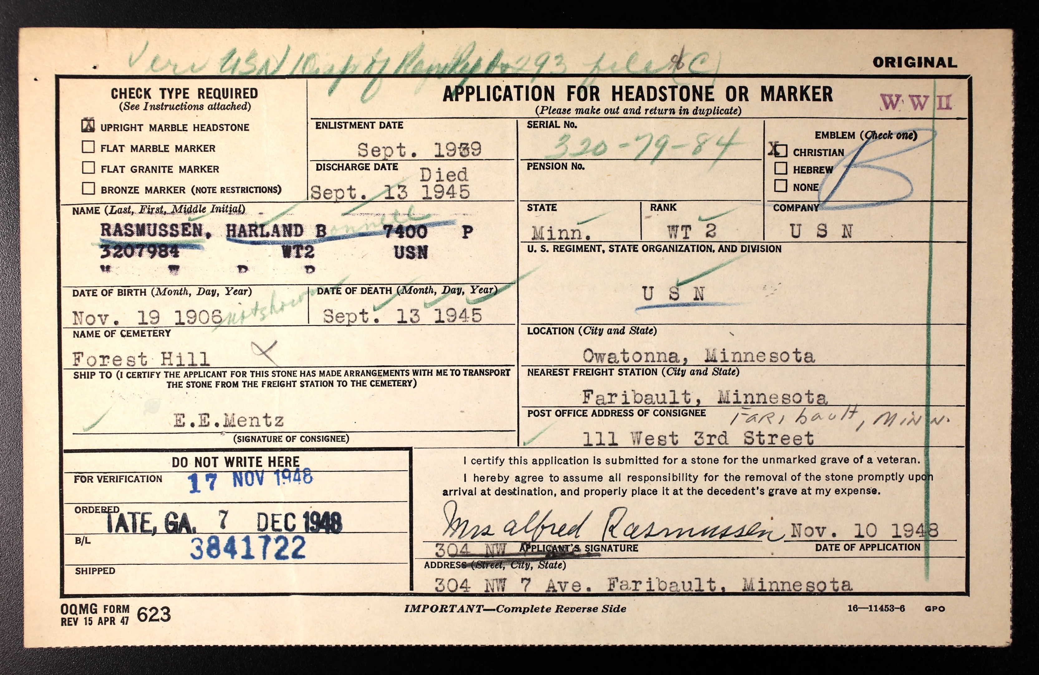 U.S., Headstone Applications for Military Veterans, for Harland B Rasmussen