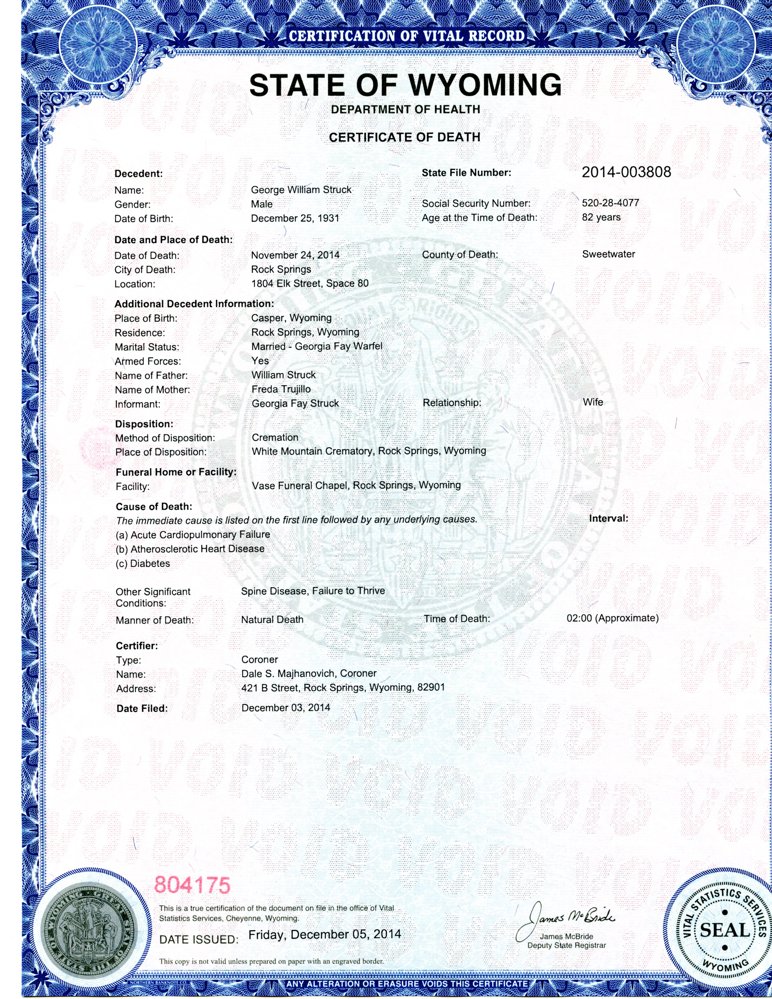 George William Struck death certificate
