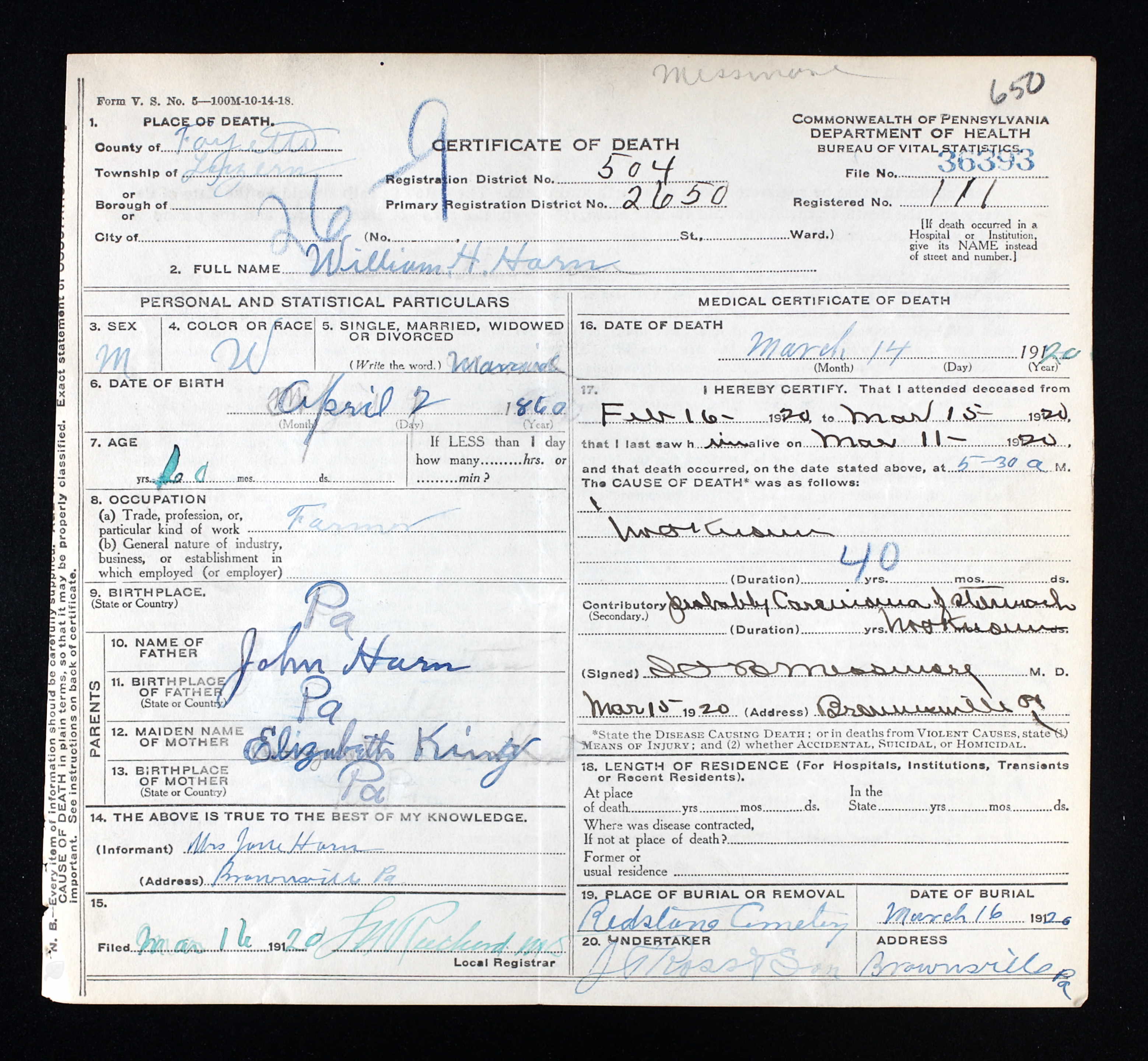 William Henry Harn death certificate