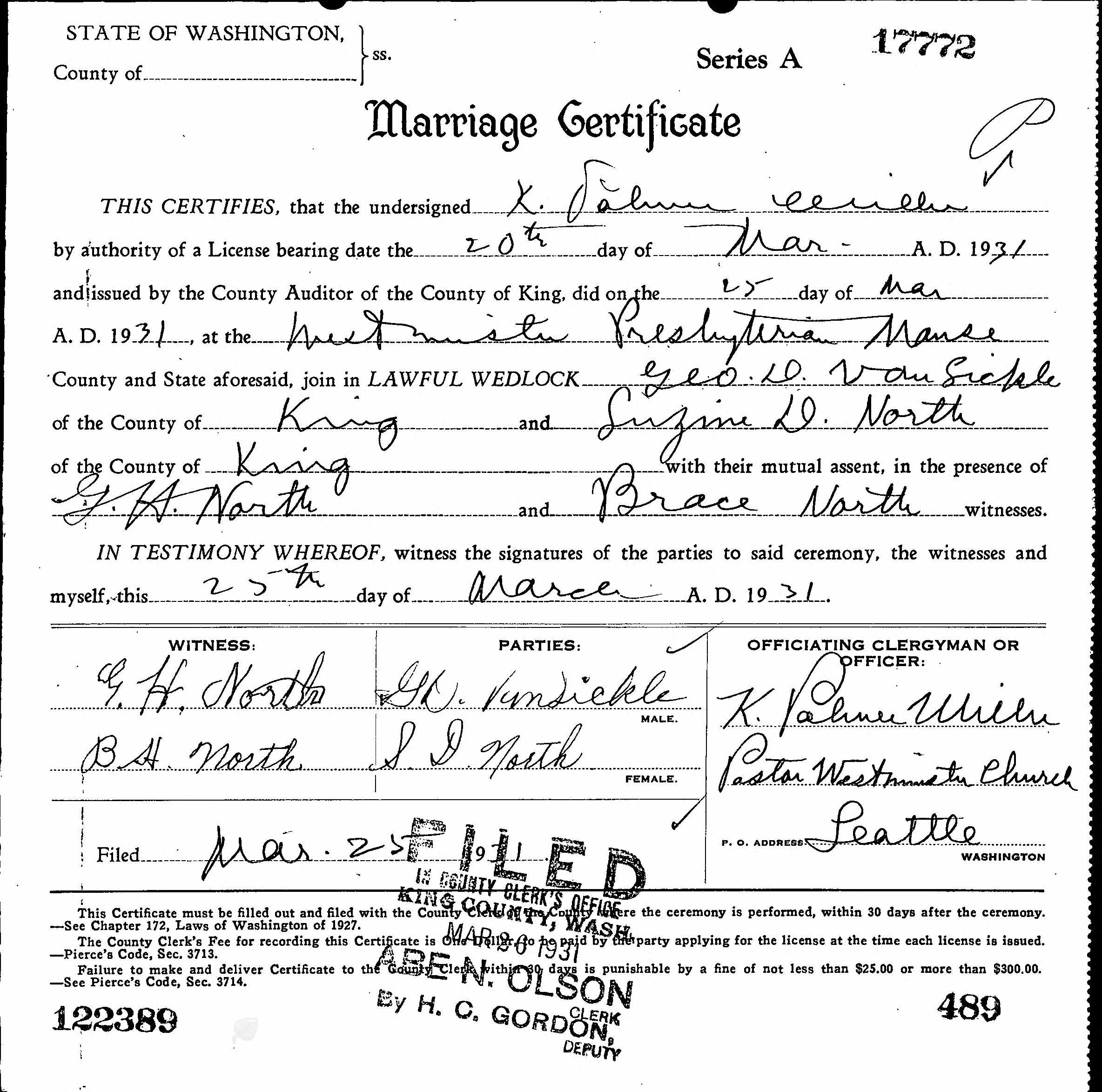 Marriage Certificate for George Daniel Van Sickle and Suzine D. North