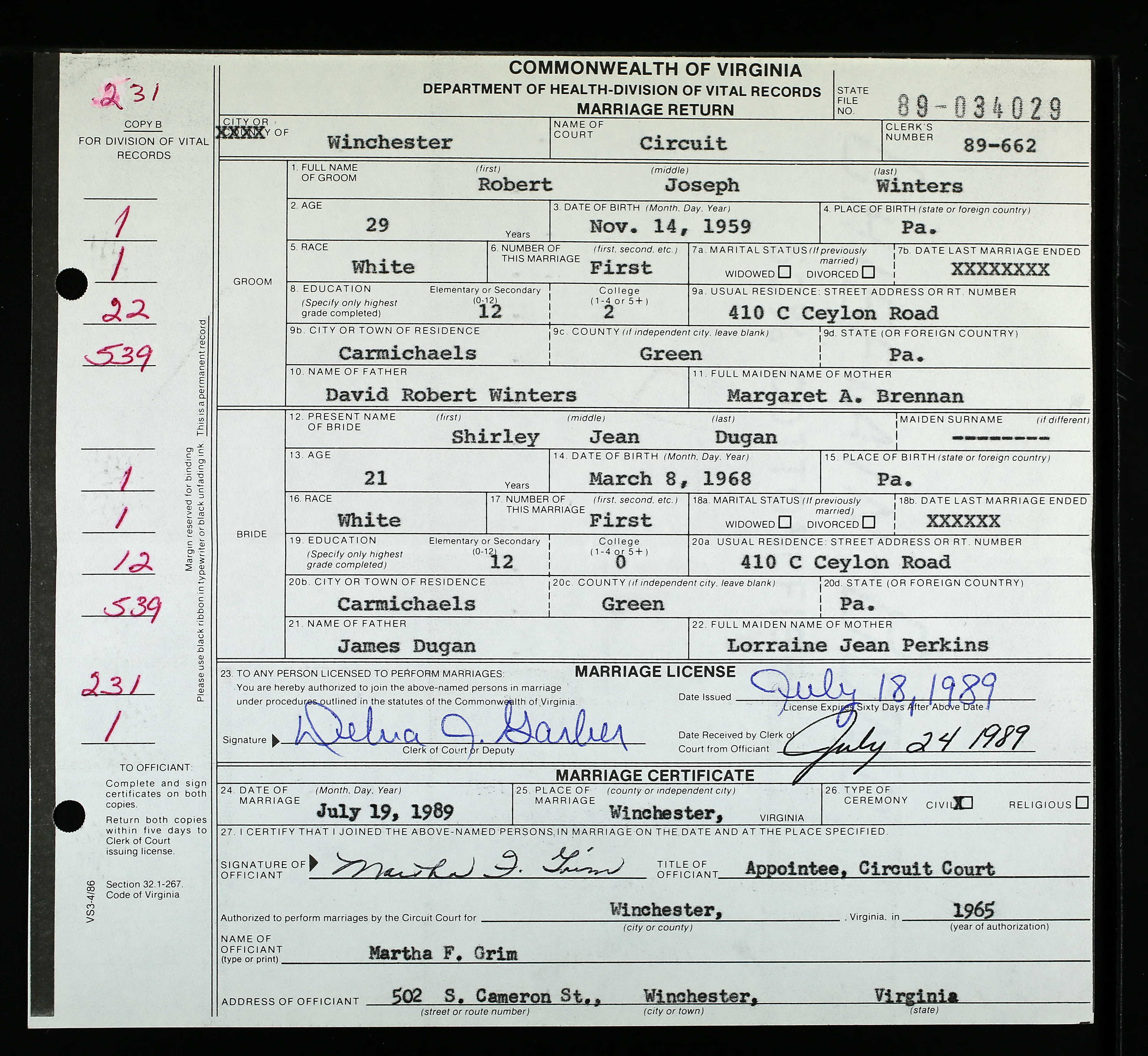 Shirley Dugan and Robert Winters marriage certificate from 1989