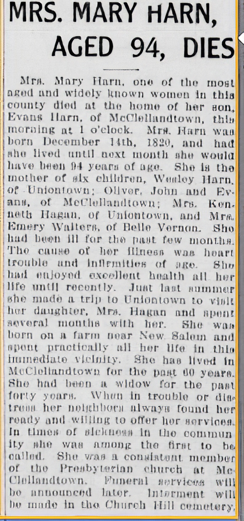 Mary (Moore) Harn obituary in 1914