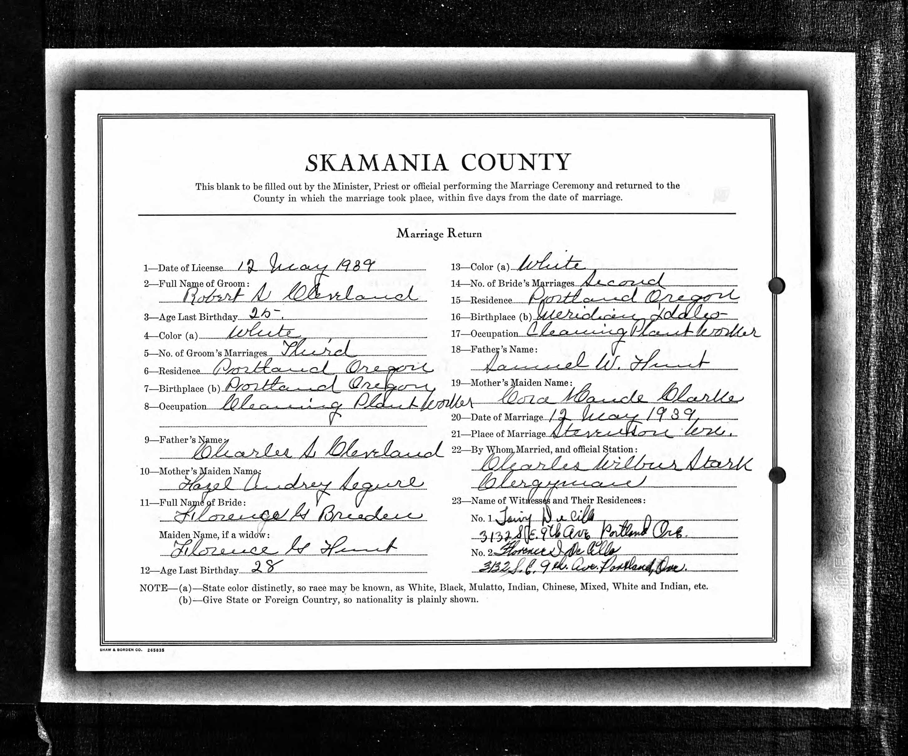 Marriage Record for Robert S. Cleveland and Florence G. Breeden