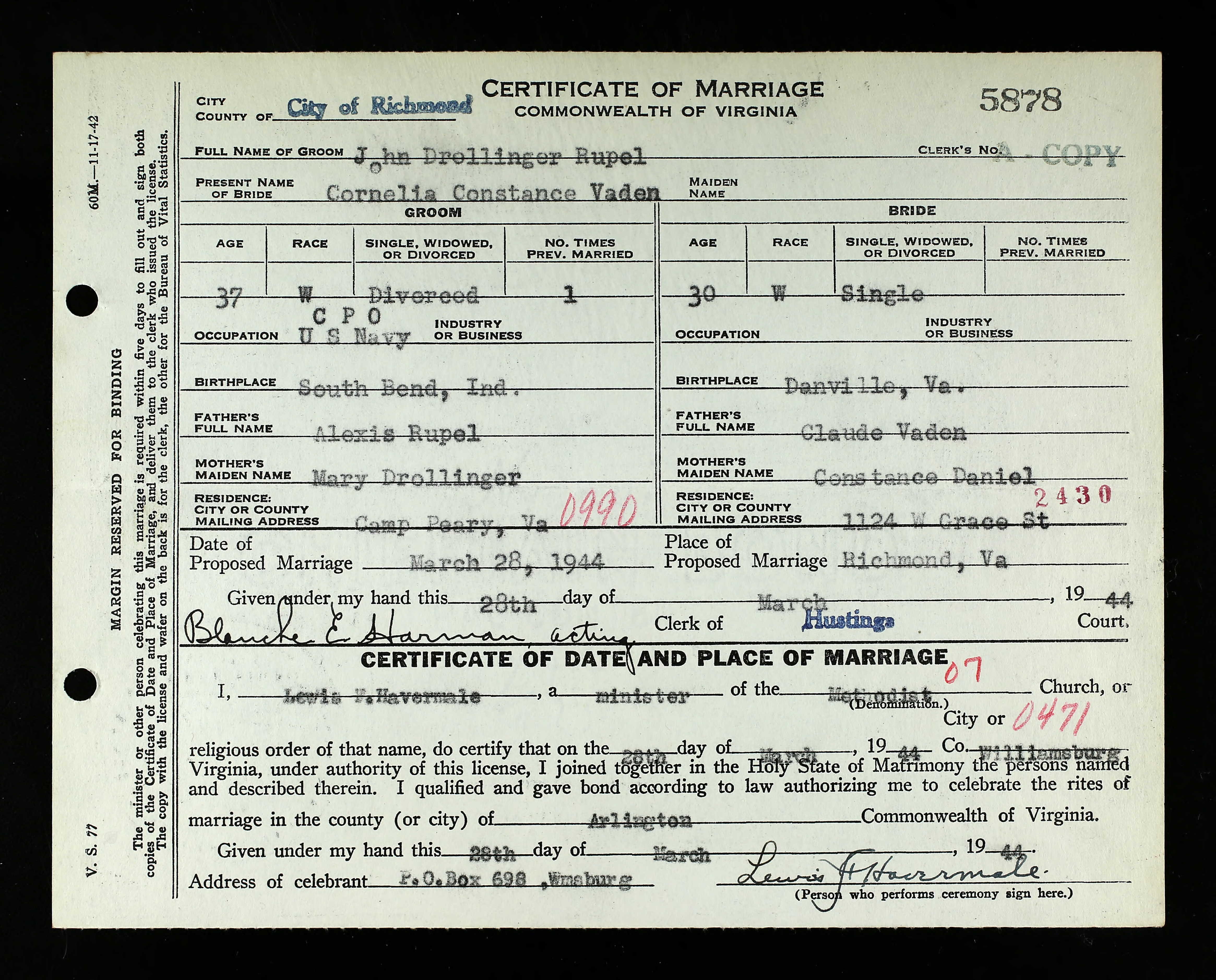 Marriage Certificate for John Drollinger Rupel and Cornelia Constance Vaden