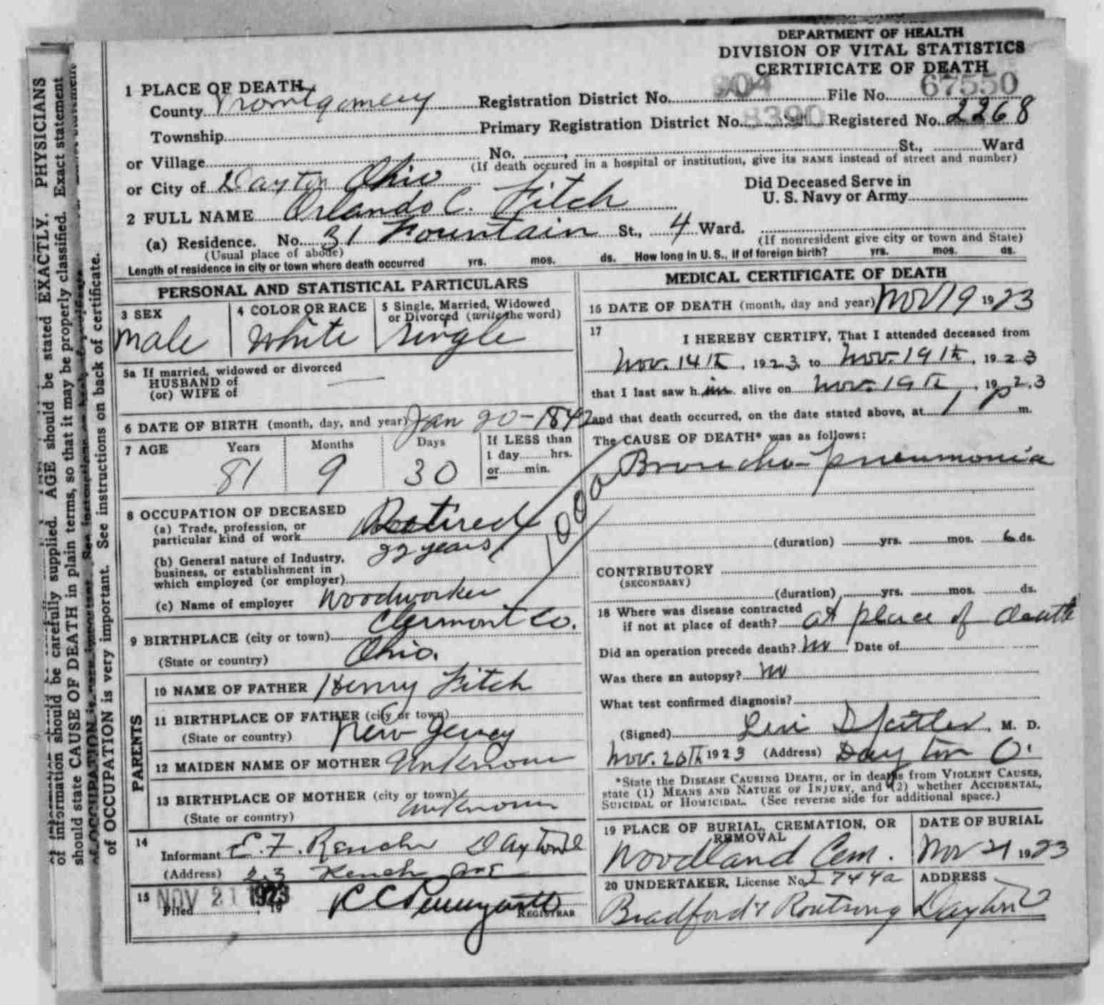 Orlando C. Fitch death certificate