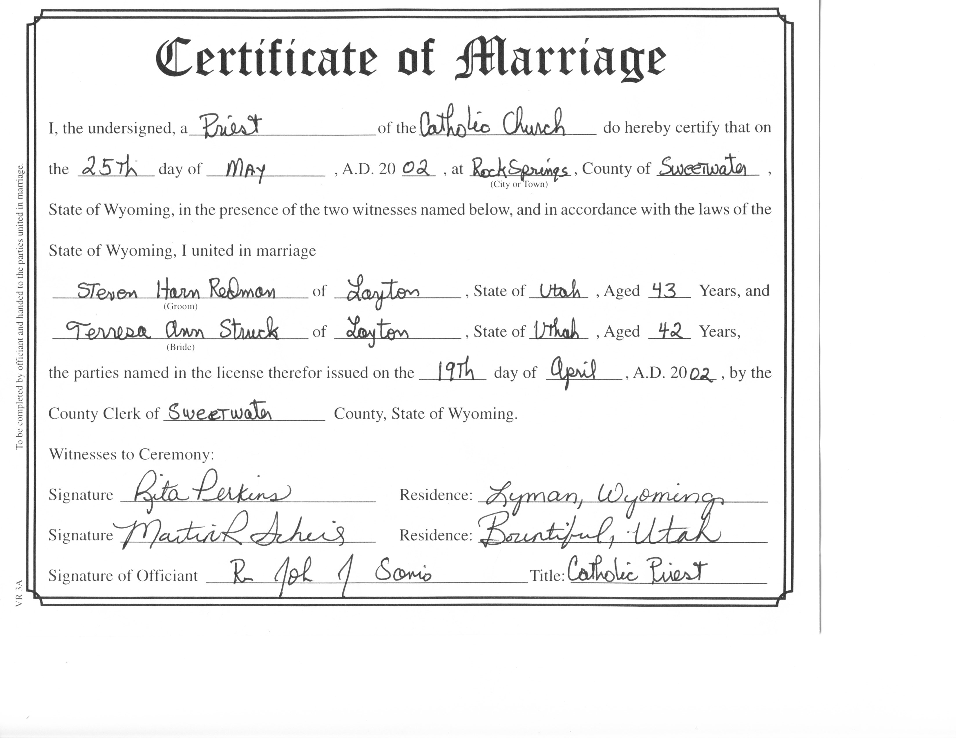Catholic Chuch Certificate of Marriage for Steve Redman and Terresa Struck