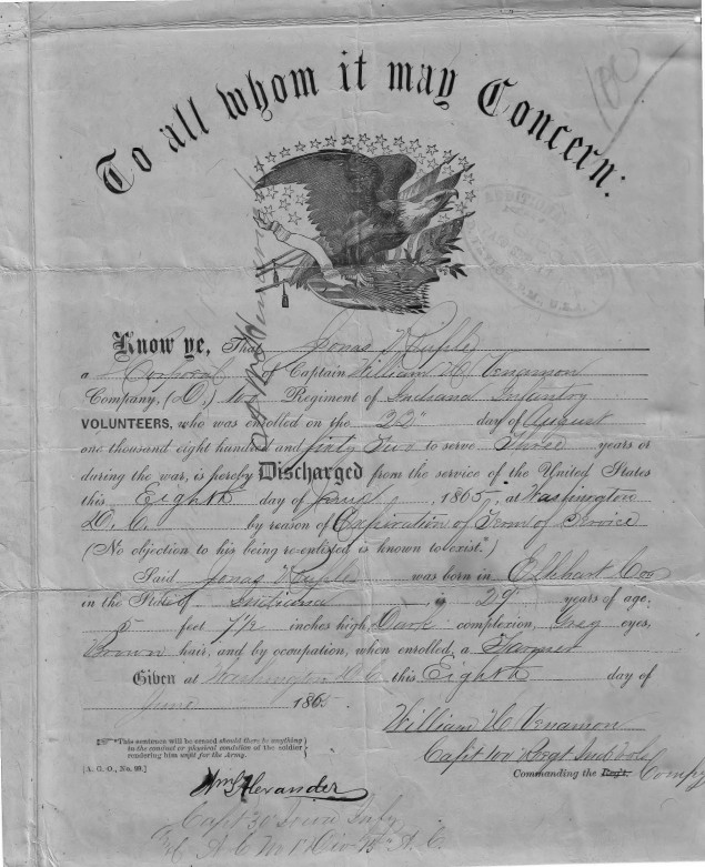 Know ye, That Jonas Ruple a Corporal of Captain William Venamon(?) Company, (D,) 100 Regiment of Indiana Infantry Volunteers, who was enrolled on the 22 day of August one thousand eight hundred and Sixty Two to serve Three years or during the war, is hereby Discharged from the service of the United States this Eight day of June, 1865, at Washington D.C. by reason of Expiration of Term of Service.